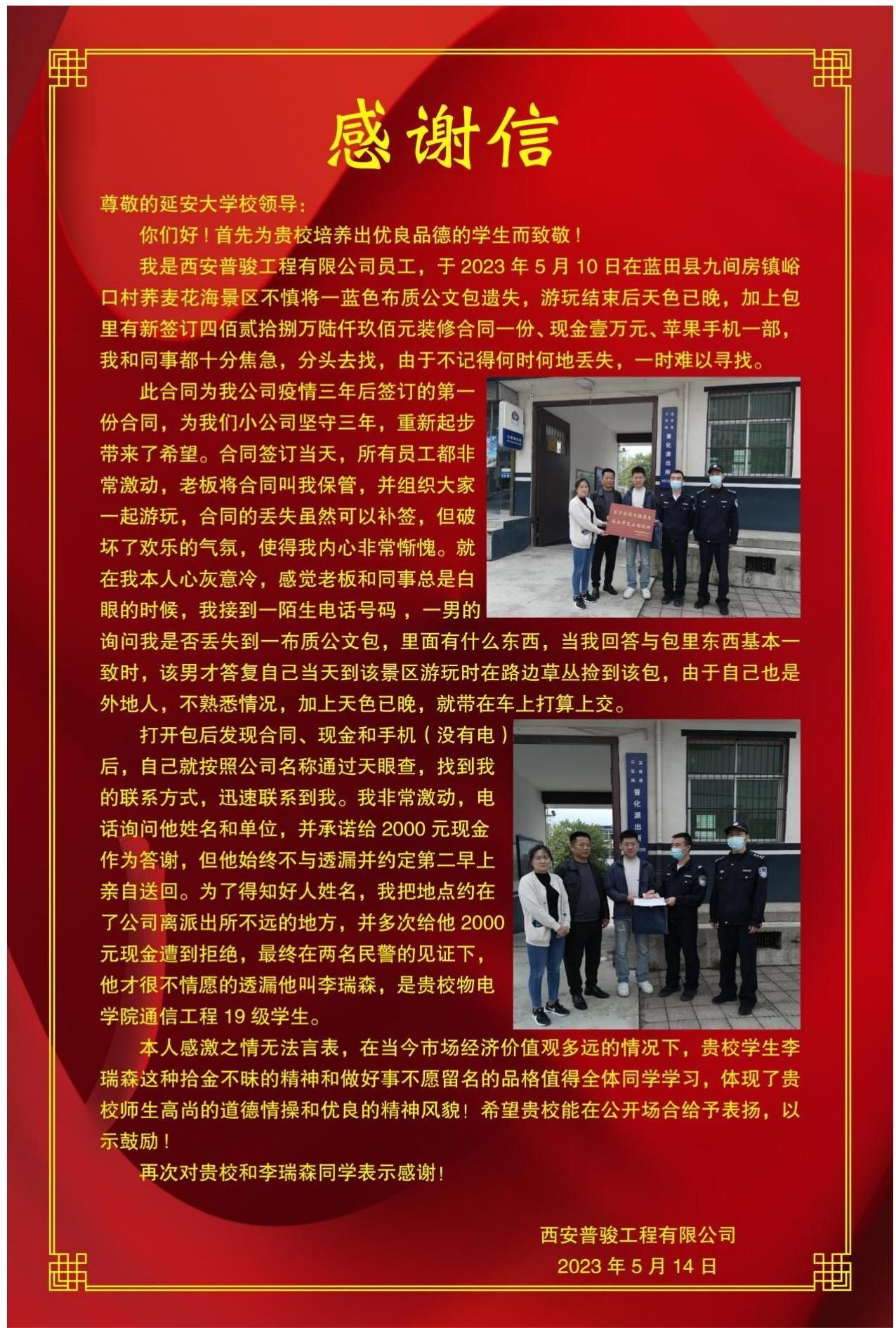 会上,全体起立奏唱中华人民共和国国歌。肖金学介绍了通信19班李瑞森同学“拾金不昧”先进事迹基本情况,宣读了公司表彰决定。张富春向李瑞森颁发了荣誉证书,常胜伟为李瑞森佩戴绶带。李瑞森在交流发言时说道:捡到东西要归失主是普通的一件小事,自己良好习惯的养成得益于优良家风中父母的言传身教,得益于母校老师的辛勤培育,特别是大学四年,在延安这片红色的沃土上,在威廉希尔足球官网这座红色熔炉中,延安精神对自己潜移默化地滋养。同学代表杨嘉成,辅导员冯晓依次作了交流发言。袁松岩老师代表公司宣读了向李瑞森同学学习的倡议书。