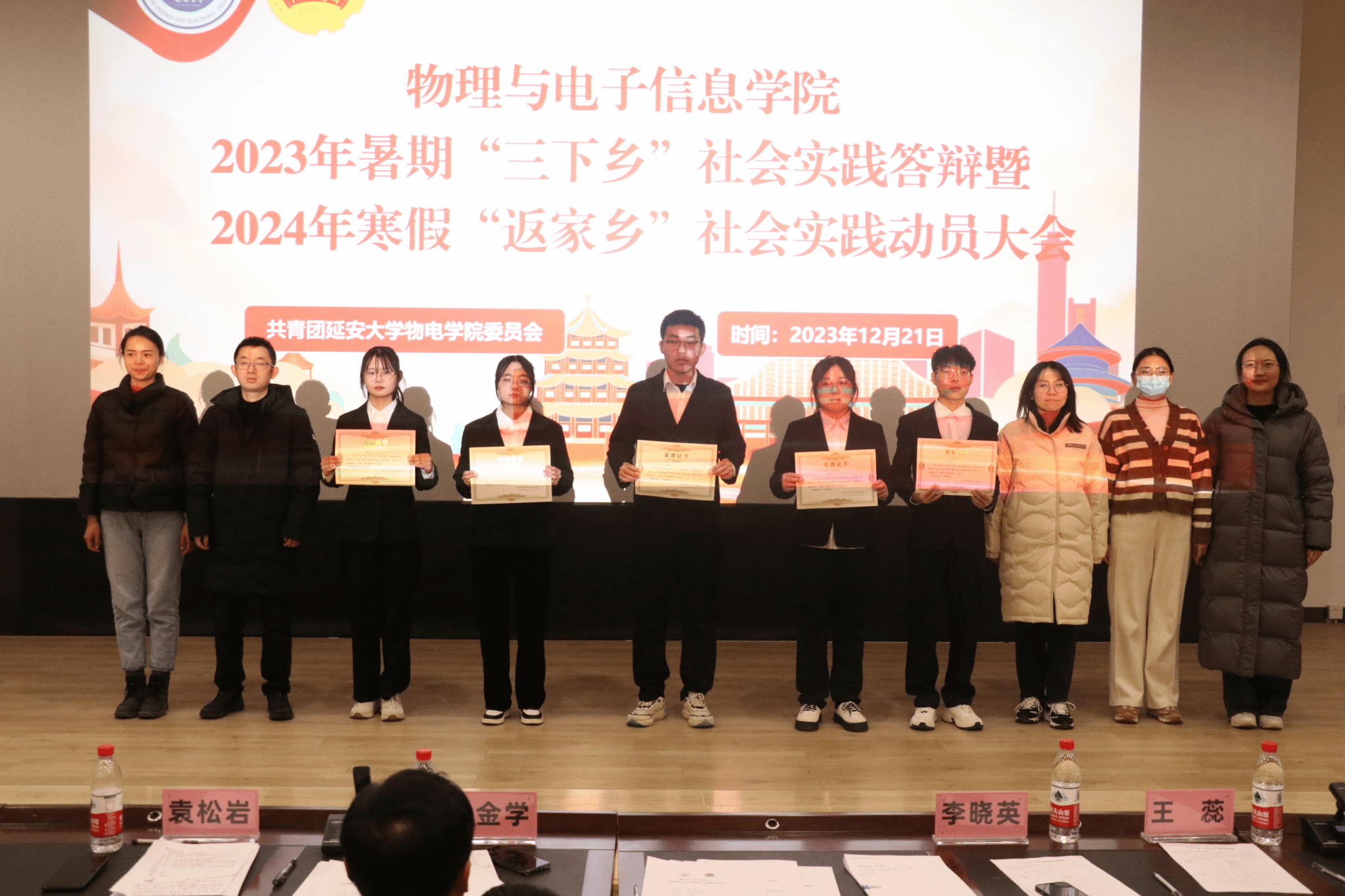 经过前期初评,共有21支实践团队入围评优答辩会。答辩现场,各实践团队代表按照抽签顺序依次上台,从实践活动背景、过程、特色、成果和感悟等方面进行汇报答辩。同学们精彩的汇报展示了公司暑期社会实践活动的丰硕成果,体现出物电学子积极服务群众,奉献社会的良好精神风貌。经过评审汇总,“情系童心·与爱‘童’行”实践团等5个团队荣获示范团队,“追寻红色足迹·传承延安精神” 实践团等5个团队荣获优秀团队。各评委老师分别为获奖团队颁发了证书。院团委书记袁松岩对2023年暑期“三下乡”社会实践工作做了总结,并就2024年寒假“返家乡”社会实践工作做了动员和安排。