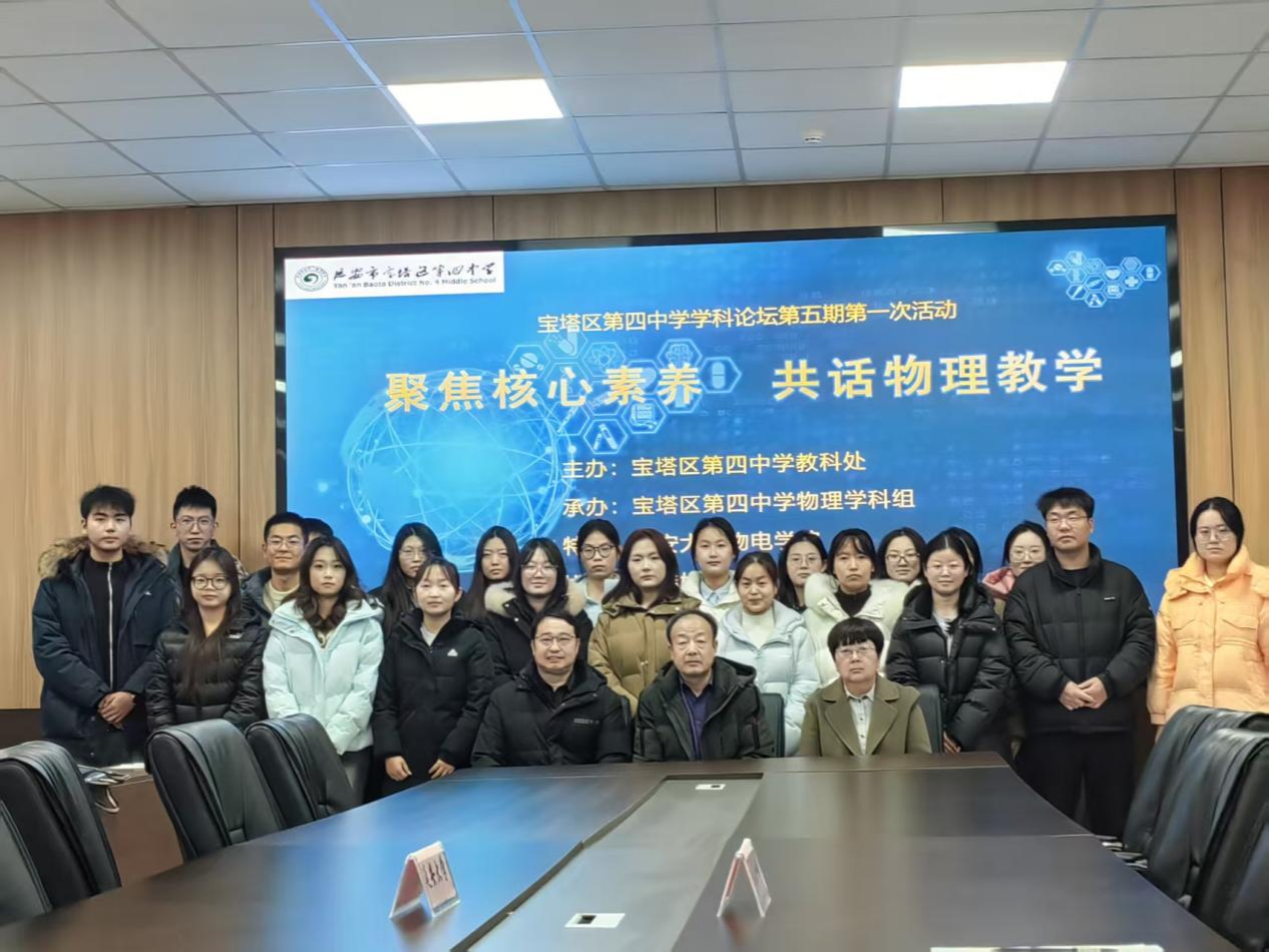 2025年12月16日下午,威廉希尔足球官网任新成教授、杨能勋教授、石延梅副教授带领学科教学(物理)专业2024级和2025级共24名研究生,赴延安市宝塔区第四中学参加“聚焦核心素养,共话物理教学”学科沙龙活动。本次活动旨在深化基础教育课程改革背景下高校与中学的协同联动,推动物理教师专业发展,提升师范生培养质量。