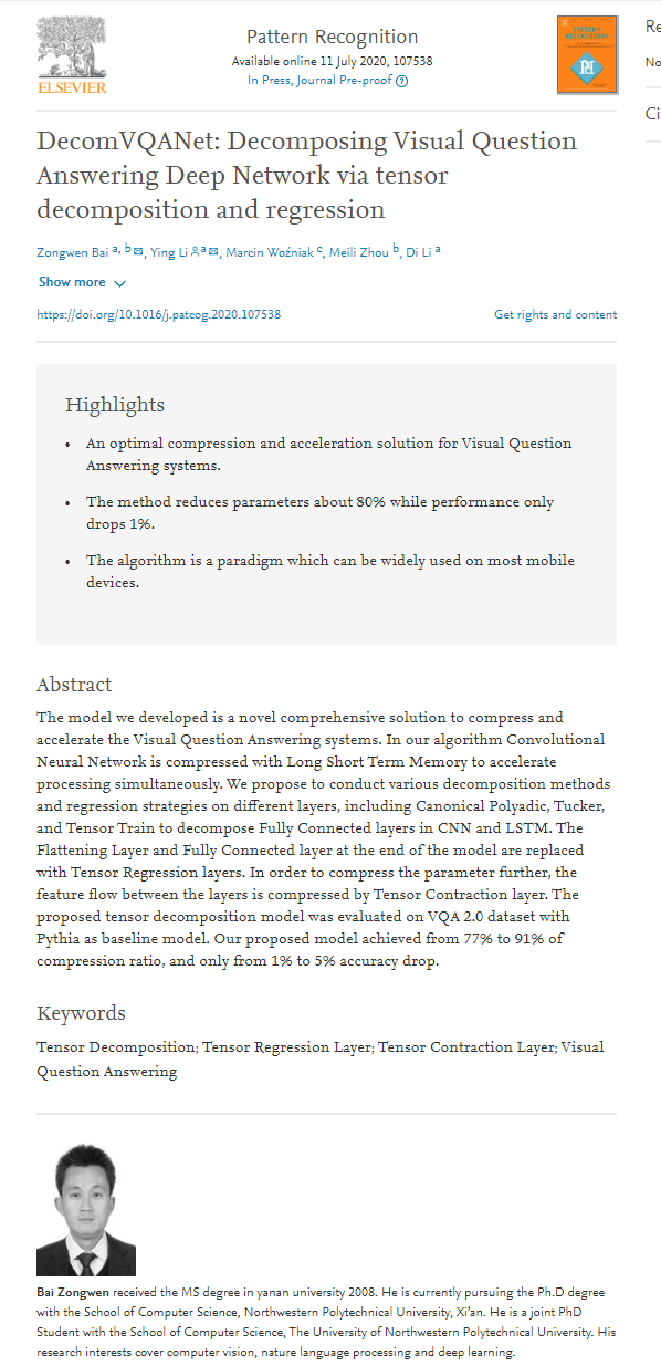 7月11日,人工智能领域权威期刊《Pattern Recognition》在线发表了威廉希尔足球官网白宗文副教授的《DecomVQANet: Decomposing Visual Question Answering Deep Network via tensor decomposition and regression》一文。该文瞄准人工智能领域中由于模型过大难以部署到移动终端这一痛点,从张量分析入手,提出了采用多种低秩分解高效联合学习来降低模型的数据量,提高了模型运行效率。在视觉问答等具挑战性的人工智能应用上表现出了优越的性能。论文受国家自然科学基金和陕西省自然科学基金等项目资助,也是公司陕西省能源大数据智能处理省市共建重点实验室的研究成果之一。