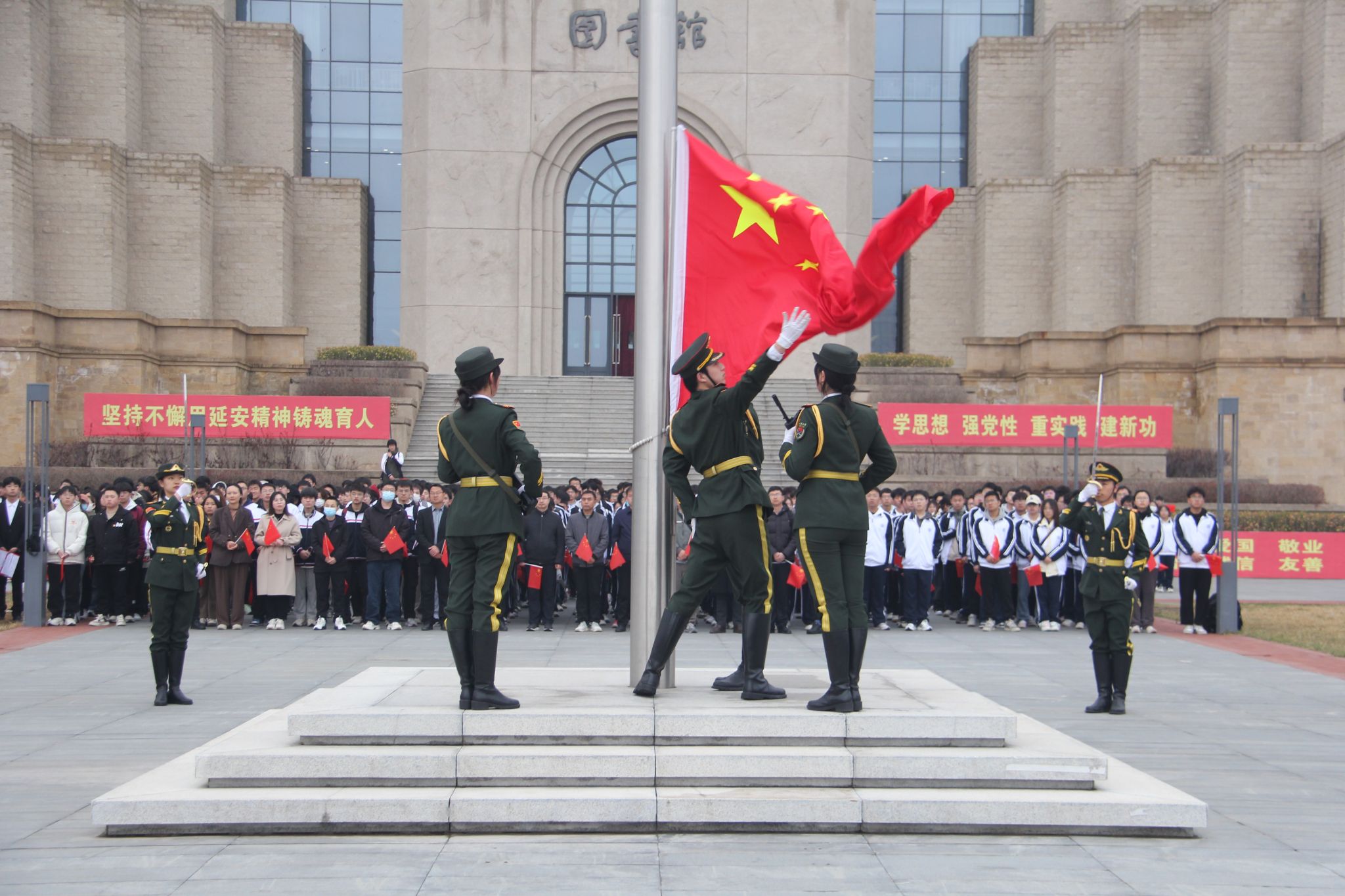 为深入学习贯彻落实习近平总书记对公司的重要批示重要指示精神,引导广大师生塑造“延大人”主人翁意识,增强校园凝聚力,繁荣爱校荣校文化,激发师生爱校之情、荣校之心、强校之行,3月25日清晨,公司在新城校区图书馆前广场举行“涵养爱党心·弘扬爱国志·厚植爱校情”主题教育暨升国旗仪式。公司党政领导、全体辅导员、班主任和师生党员代表及2022级、2023级员工共800余人参加活动。
