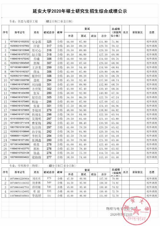 根据《教育部办公厅关于做好2020年全国硕士研究生复试工作的通知》(教学厅〔2020〕4号)文件和陕西省教育考试院有关文件和会议精神、威廉希尔足球官网《关于做好2020年硕士研究生复试录取工作的通知》相关规定,公司根据第一批复试情况,于5月22日组织第二批(校外调剂)复试,现就复试后综合成绩予以公示,公示期为 2020年5月23日上午11:00至2020年5月24日上午11:00,如有考生对成绩有疑问,可在公示期间以电话、电子邮件形式反馈,逾期不予受理。