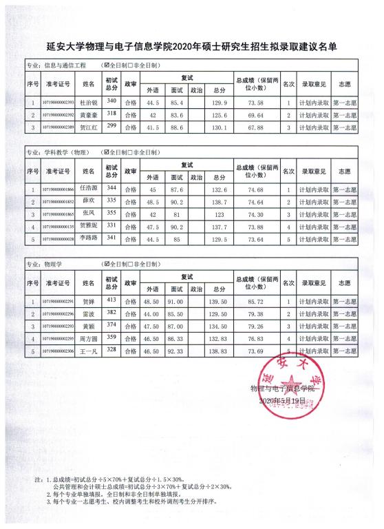 根据《教育部办公厅关于做好2020年全国硕士研究生复试工作的通知》(教学厅〔2020〕4号)文件和陕西省教育考试院有关文件和会议精神、威廉希尔足球官网《关于做好2020年硕士研究生复试录取工作的通知》相关规定,公司2020年一志愿硕士研究生招生复试工作已完成,现就复试后拟录取建议名单予以公示,公示期为 2020年5月19日下午2:00至2020年5月22日下午2:00,如有考生对成绩有疑问,可在公示期间以电话、电子邮件形式反馈,逾期不予受理。