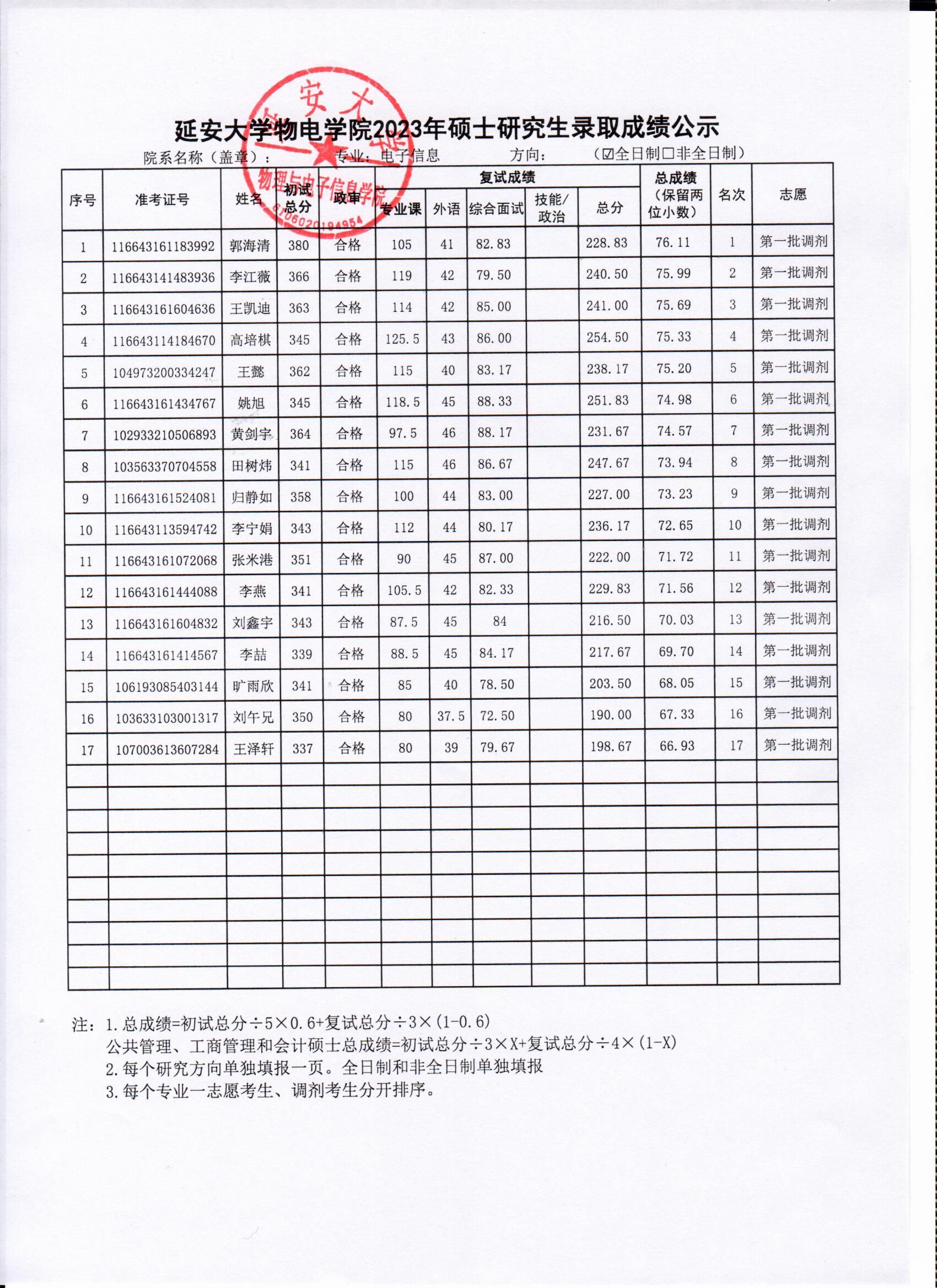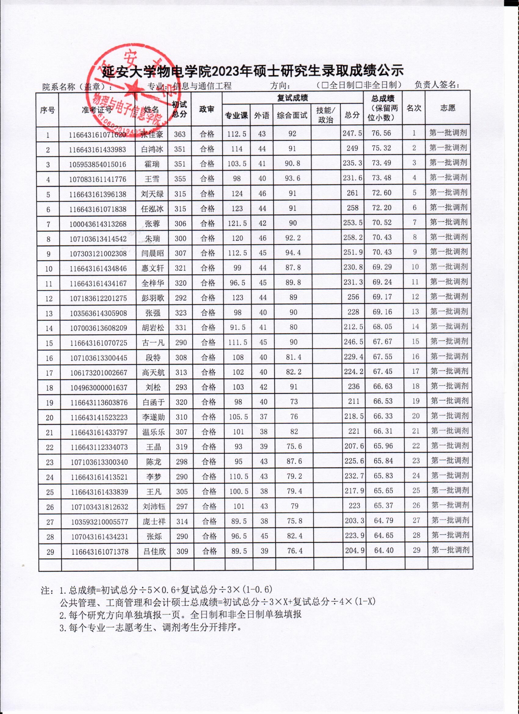 依照公司2023年硕士研究生复试工作实施方案,安排在2023年4月11日的电子信息和信息与通信工程专业调剂考生复试工作已经圆满结束,现将具体的复试成绩进行公示,公示时间为十个工作日。