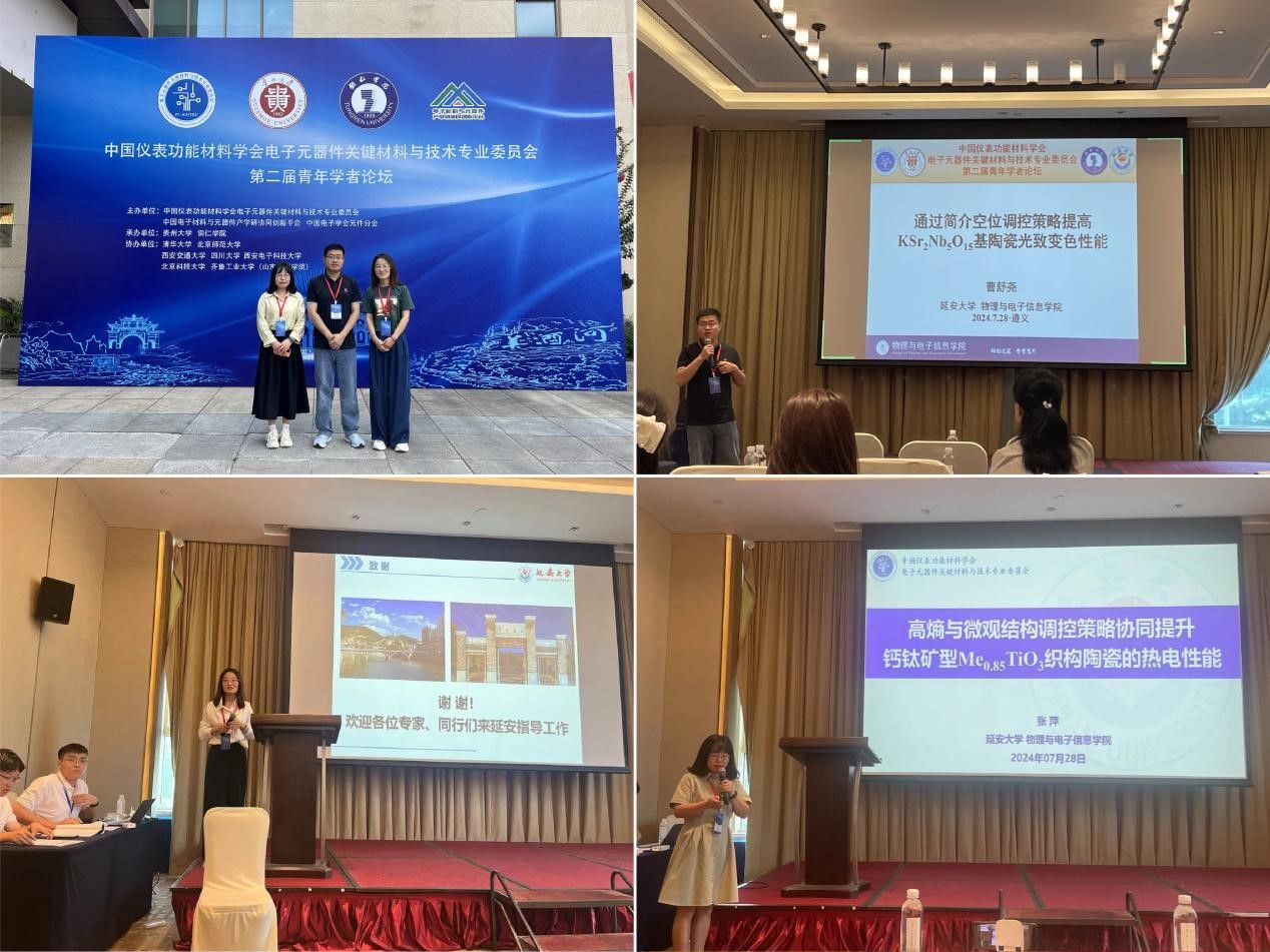 公司青年教师曹舒尧、康芳、张萍分别作题为《通过间接空位调控策略提高KSr2Nb5O15基陶瓷的光致变色性能》、《组分调控铁酸铋-钛酸钡基弛豫铁电陶瓷电致应变性能的研究》、《高熵与微观结构调控策略协同提升钙钛矿型Me0.85TiO3织构陶瓷的热电性能》的邀请报告,三人分别荣获组委会评审推荐的优秀学术报告。曹舒尧副教授作为分会场主持人,主持了28日下午“铁电与热释电材料及器件”分会场的学术报告。
