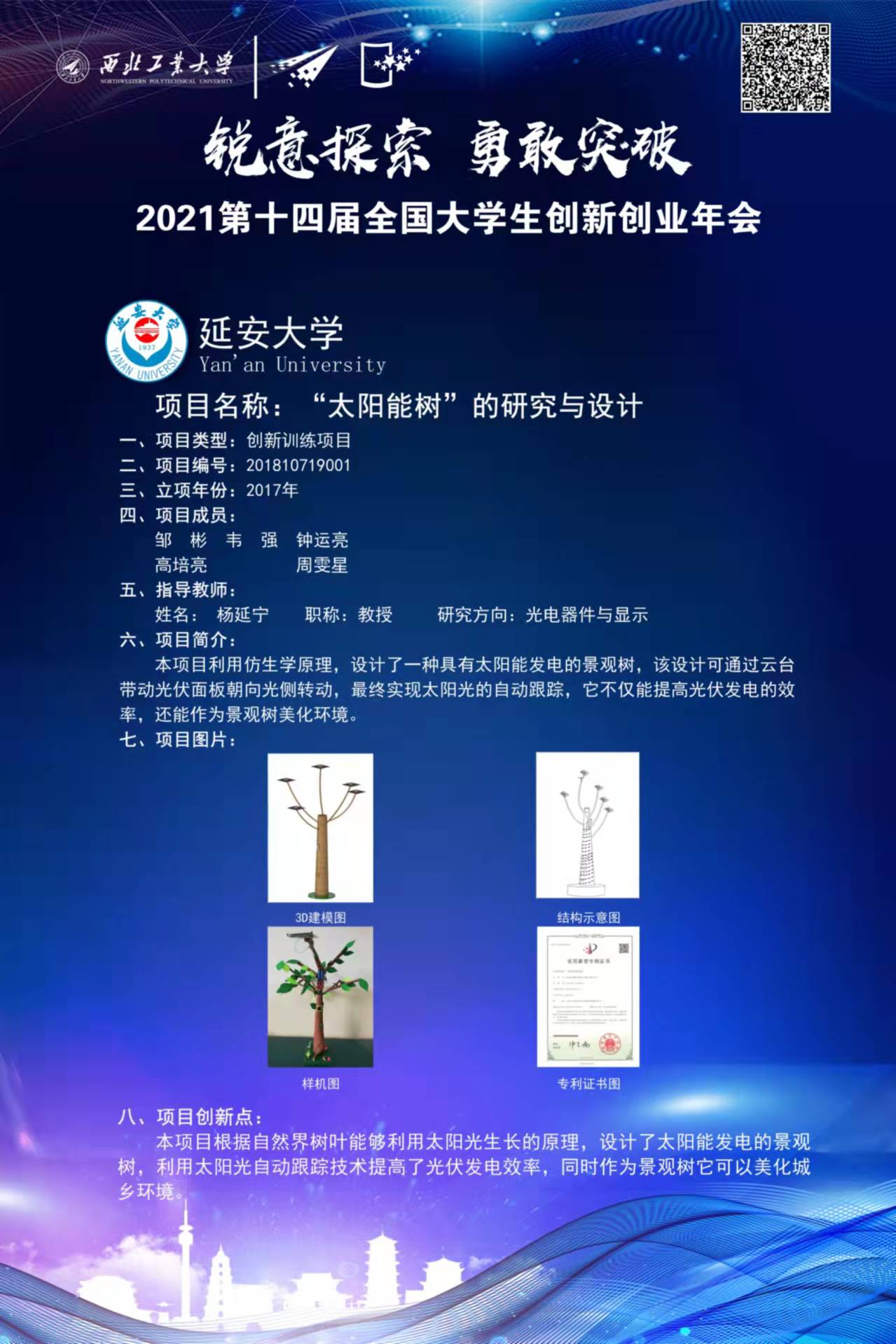公司杨延宁教授指导、员工邹彬主持完成的“太阳能树”的研究与设计国创项目成功入选,是公司唯一入选的大创项目,该项目于2017年立项,项目利用仿生学原理,设计了一种具有太阳能发电的景观树,该设计可通过云平台带动光伏铭板朝向光侧转动,最终实现太阳光的自动跟踪,不仅能提高光伏发电的效率,还能作为景观树。通过参加本次全国老员工创新创业年会,提高了公司的知名度,同时进一步深化高校创新创业教育改革,加强公司与其他公司的交流与沟通,为员工搭建创新创业交流展示平台,展示高校创新创业教育方面的成果,促进高校创新创业教育和文化建设。该项目的入选,是公司老员工创新创业工作的一个突破。